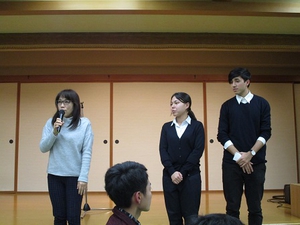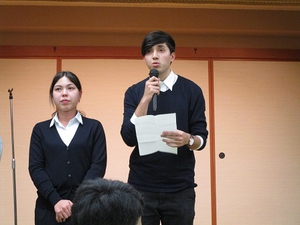 今回の望年会には、学校長の松本雅美様と、弊社学生奨学金第一回給付生のツノセ・クサノ・ニコラス(津ノ瀬ニコラス)さんとオイカワ・マルセラ・ミホ(及川ミホ)さんのお二人に出席していただきました。